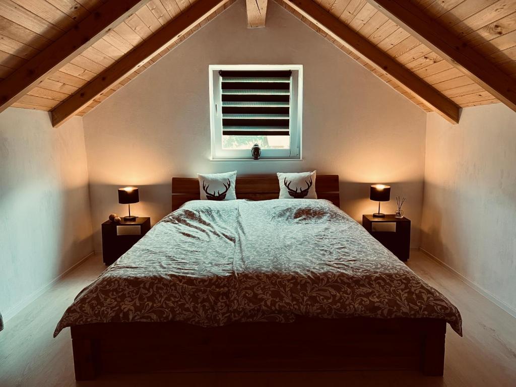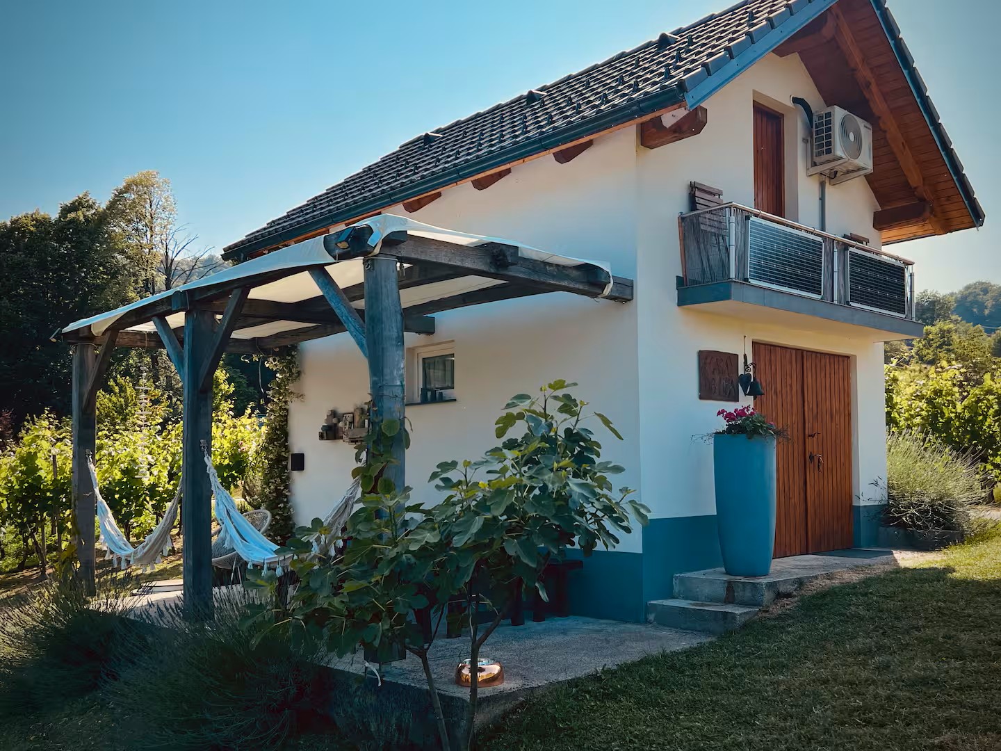 Beautifully furnished across two floors, the house features a comfortable double bed, a fully equipped kitchen, Wi-Fi, TV, air conditioning, and free parking. On the terrace with relaxing hammocks, you can enjoy panoramic views of the vineyards and Gorjanci. It’s the perfect choice for those seeking peace and quiet in nature.